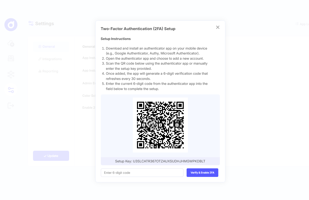- The 2FA Setup modal opens