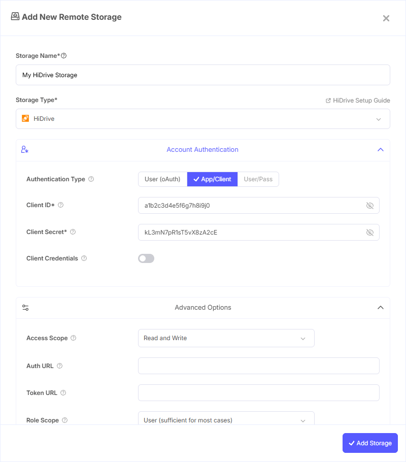 - Storage Name: A friendly name (e.g., "HiDrive Backups")