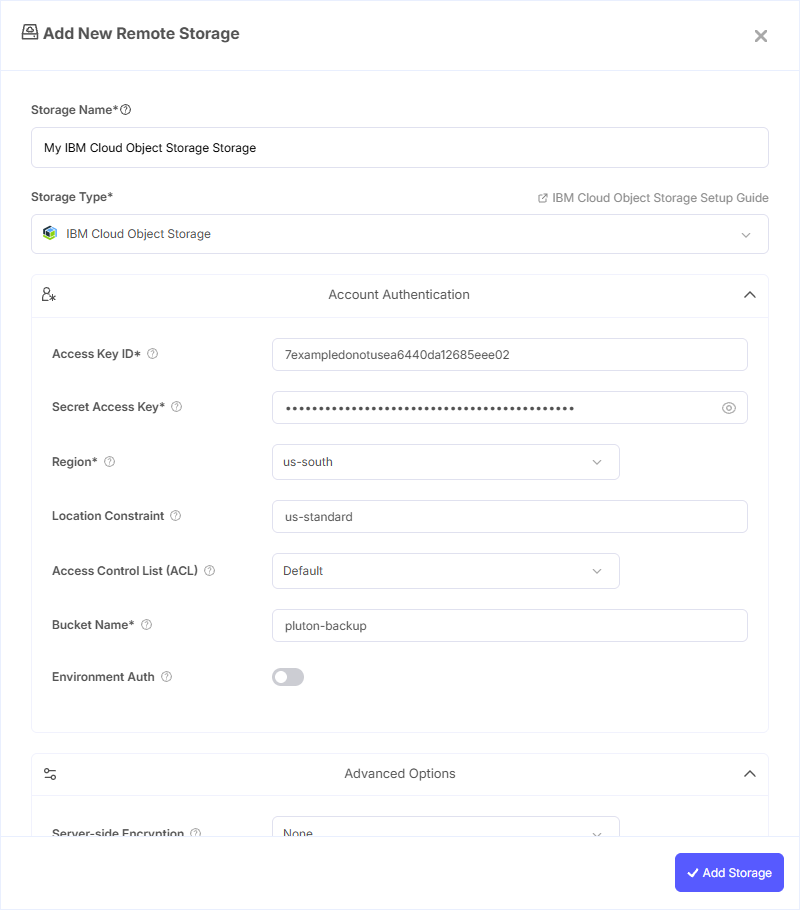 - Storage Name: A friendly name (e.g., "IBM COS Backups")