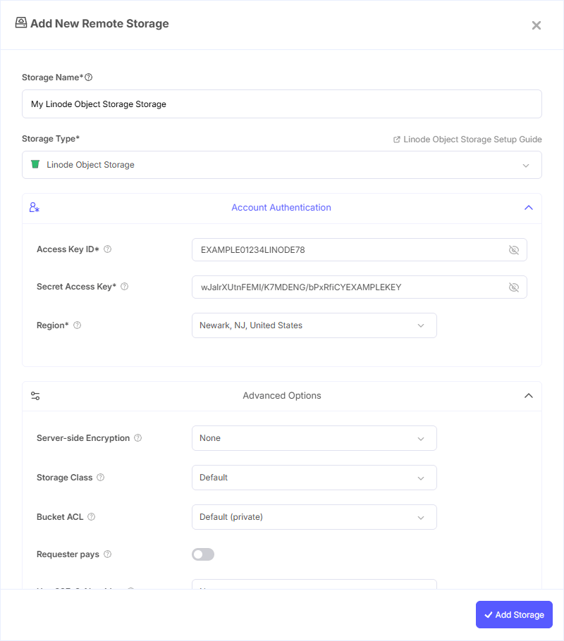 - Storage Name: A friendly name (e.g., "Linode Backups")
