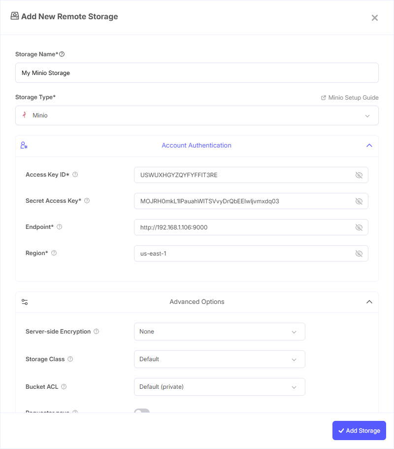 - Storage Name: A friendly name (e.g., "MinIO Local Backups")