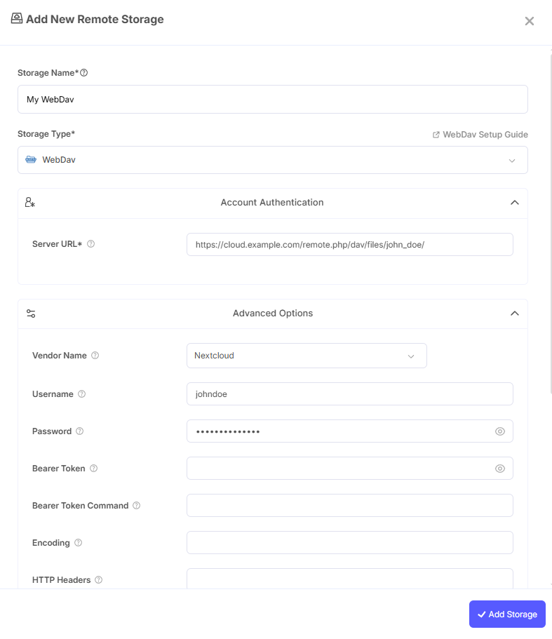 - Storage Name: A friendly name (e.g., "Nextcloud Backups")