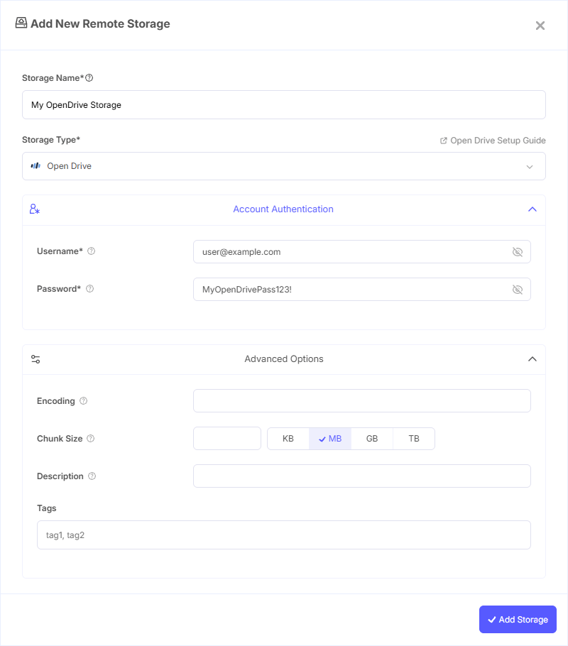 - Storage Name: A friendly name (e.g., "OpenDrive Backups")