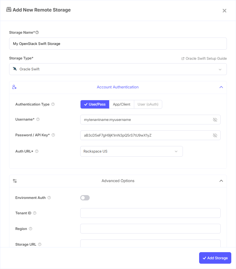 - Storage Name: A friendly name (e.g., "Swift Production Backups")