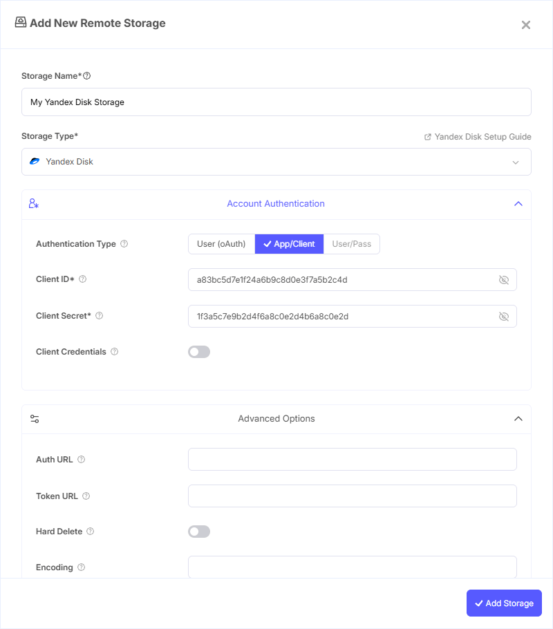 - Storage Name: A friendly name (e.g., "Yandex Disk Backups")